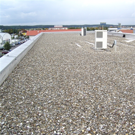 Warmdach, Untergrund Trapezblech, Wärmedämmung aus Mineralwolle, Abdichtung aus Hochpolymerdachbahn, PVC weich, 1.2 mm Donaukies 16/32 mm